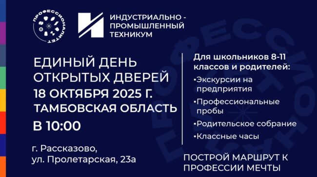 18 октября Индустриально-промышленный техникум приглашает школьников и их родителей на Единый день открытых дверей ФП «Профессионалитет»! «Профессионалитет» — это твой шанс быстро получить актуальную специальность, учиться на самом современном оборудовании и построить успешную карьеру. В рамках Дня открытых дверей вас также ждут: • Всероссийский классный час «Профессионалитет: ты в хорошей компании!» (с 7 по 18 октября). • Экскурсии на предприятия наших партнеров-работодателей (с 7 по 18 октября). А 18 октября ждём всех по адресу: г. Рассказово, ул. Пролетарская, 23а. С 10:00 до 13:00 для вас: • Презентация проекта «Профессионалитет»: Узнайте все о программах, сроках обучения и преимуществах. • Встреча с работодателями: Задайте вопросы будущим наставникам и руководителям ведущих предприятий. • Профессиональные пробы: Попробуйте себя в деле! Погрузитесь в реальные рабочие задачи под руководством опытных мастеров. Внимание, родители!